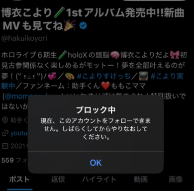 博衣こよりさんは、今回の騒動の影響で一般人をブロックしていることがわかりました。